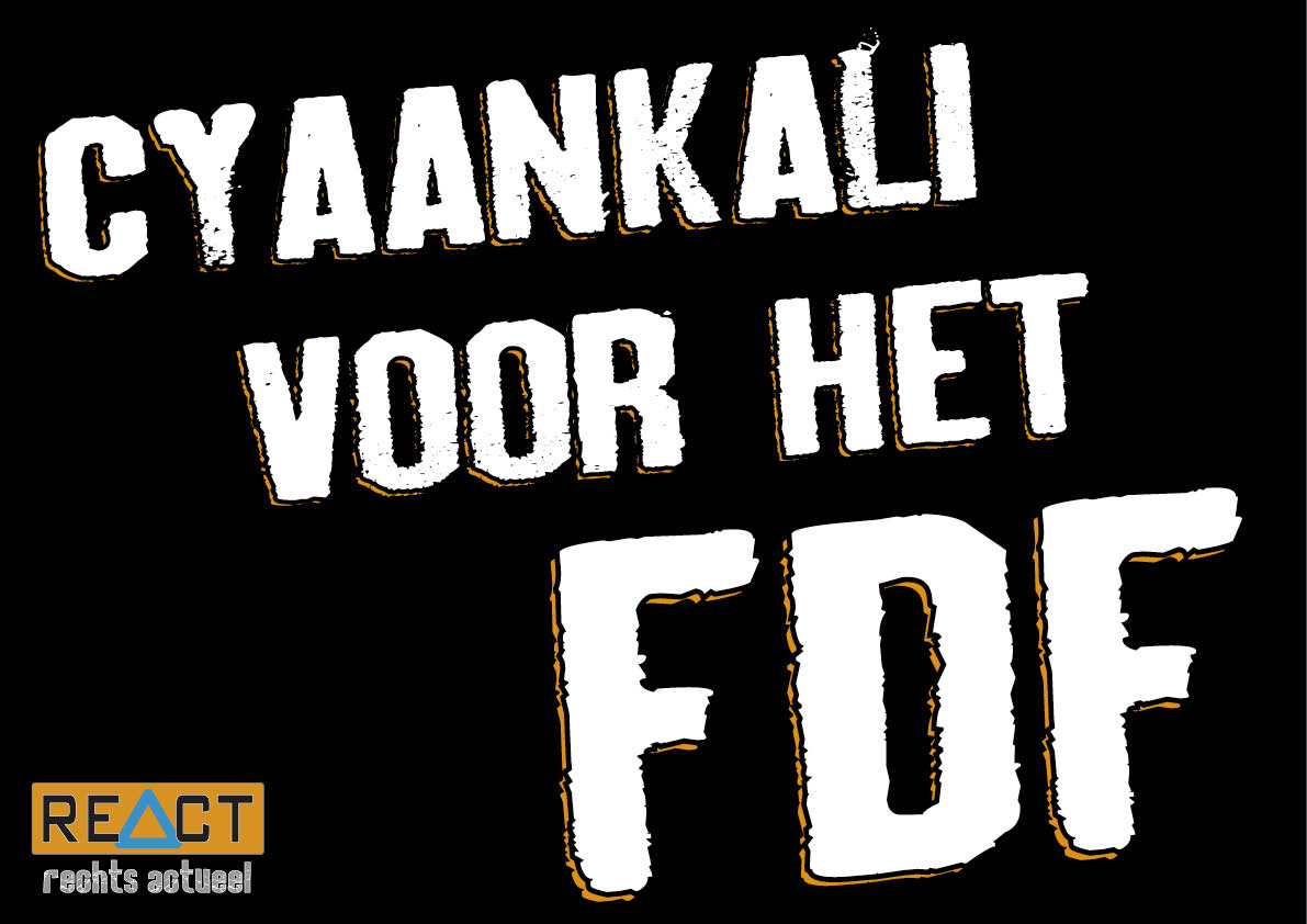 De slogan ‘Cyaankali voor het FDF’ is een veelgebruikte roepzin bij betogingen van de Vlaamse Beweging die in de omgeving van Brussel plaatsvinden. Ze dient allerminst begrepen te worden als een oproep tot het uitmoorden van eenieder die een lidkaart van deze Francofiele partij op zak heeft. Wél willen we hiermee zeggen dat we het FDF als partij liever zien verdwijnen uit de Brusselse en nationale politiek. Deze partij zou overigens zonder de collaboratie van de liberale MR nooit enige kans op overleven hebben, dus van een ‘democratisch verkozen partij’ is absoluut geen sprake. Wél van een arrogante, Fransdolle en uitermate fascistisch ingestelde partij met imperialistische neigingen. Napoleon zou verbleken bij de expansiedrang van Oliviér Maingain.