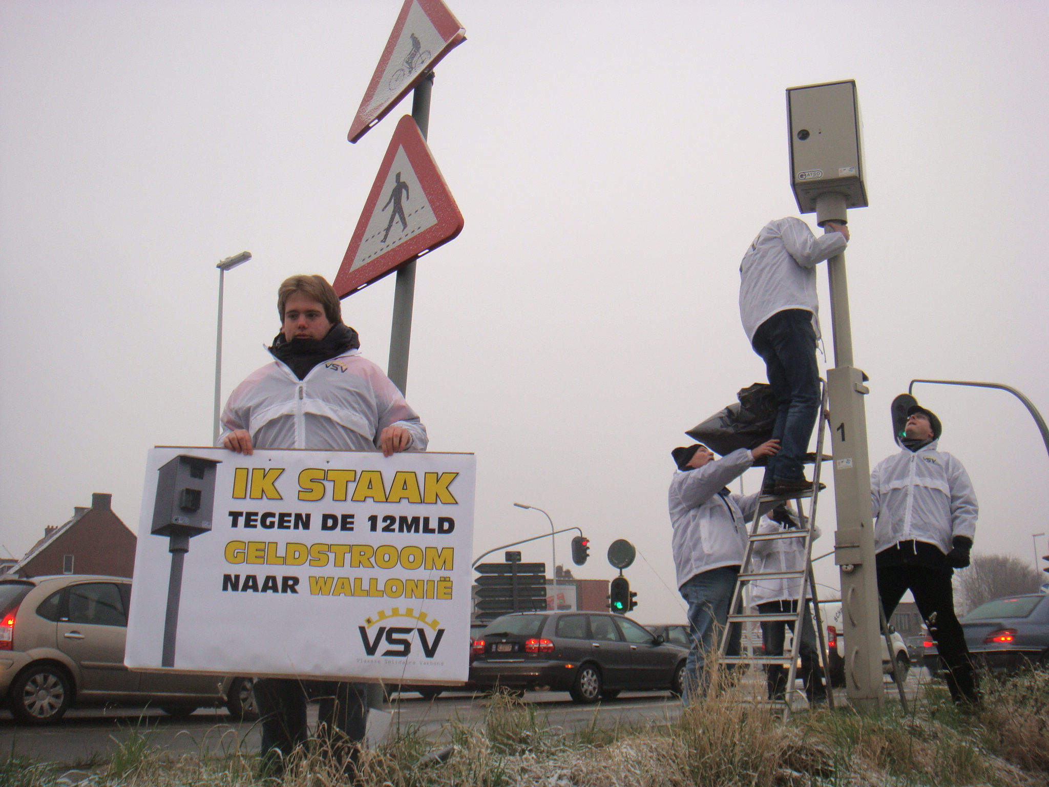 Om ABVV, ACV en ACLVB te herinneren aan die schandalige geldstroom heeft de Vlaamse Solidaire Vakbond VSV vandaag een ‘flitspalenstaking’ georganiseerd. Dat gebeurde door her en der in Vlaanderen flitspalen te overtrekken met een grote vuilniszak, en te voorzien van een affiche met de tekst: ‘Ik staak tegen de geldstroom naar Wallonië’.