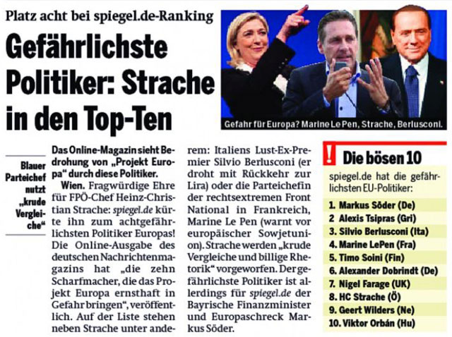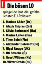 De Duitse krant Spiegel pakt uit met een merkwaardige top-10: ‘Die bösen 10’. De meeste namen in deze lijst behoren bijna vanzelfsprekend tot het Europese rechtse kamp. Zowel Silvio Berlusconi (3), Marine Le Pen (4), Nigel Farage (7), HC Strache (8) als Geert Wilders (9) bevolken de lijst. Hoe beland je in deze lijst? Door je te verzetten tegen de Europese Unie in zijn huidige vorm en het ESM (lees hier). Strache is verwonderd: “Wanneer je het verzet leidt tegen de EU- en de ESM-dictatuur, wanneer je voor de directe democratie bent en wanneer je vraagt dat belastinggeld besteed wordt aan de eigen bevolking in plaats van het redden van dure banken, dan behoor je blijkbaar vanzelfsprekend tot de gevaarlijkste politiekers van Europa.
