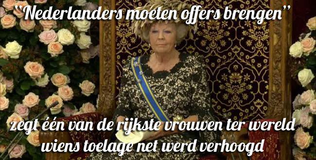 Wrang, want in de laatste toespraak van de koningin deelde ze mee dat “het Nederlands volk offers moest brengen in het licht van de huidige crisis”. En dat net nadat haar jaarlijkse dotatie wel naar boven was bijgesteld.