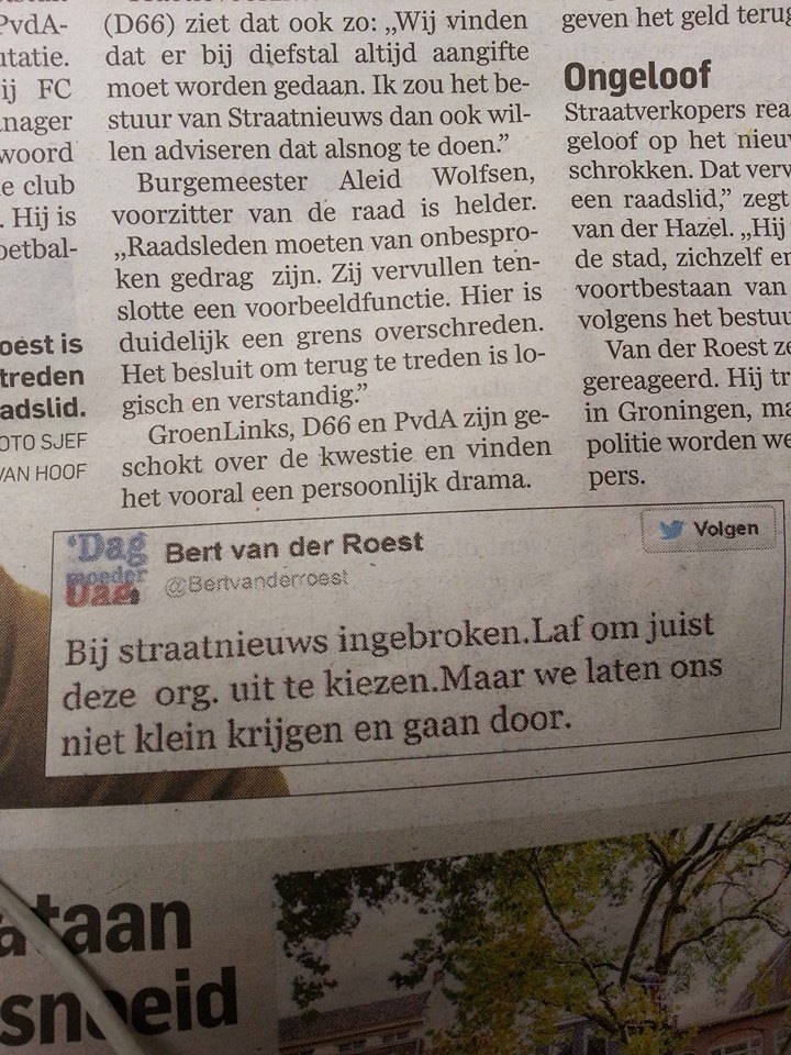 Wel, ook in Utrecht bestaat er een Daklozenkrant. Vanuit de daklozenkas werden de krantjes betaald en Bert van der Roest was daar de penningmeester. Nu blijkt dat de socialist 40.000 euro heeft gestolen in één jaar tijd. Onder meer rondjes in de kroeg en een vakantie in Griekenland werden bekostigd van het spaargeld van de daklozen.